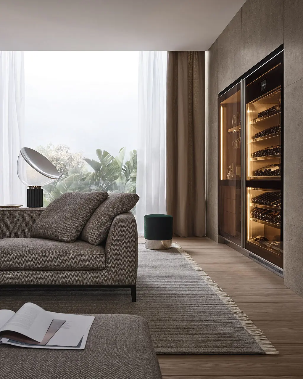 Обе системы имеют общие параметры — высоту 213 см и глубину 60 или 70 см, что позволяет объединить их в монументальный блок под копланарными дверцами или встроить в систему панелей. Стеклянные фасады Stopsol и деликатная внутренняя подсветка в обоих модулях создают эффектную световую инсталляцию в интерьере.